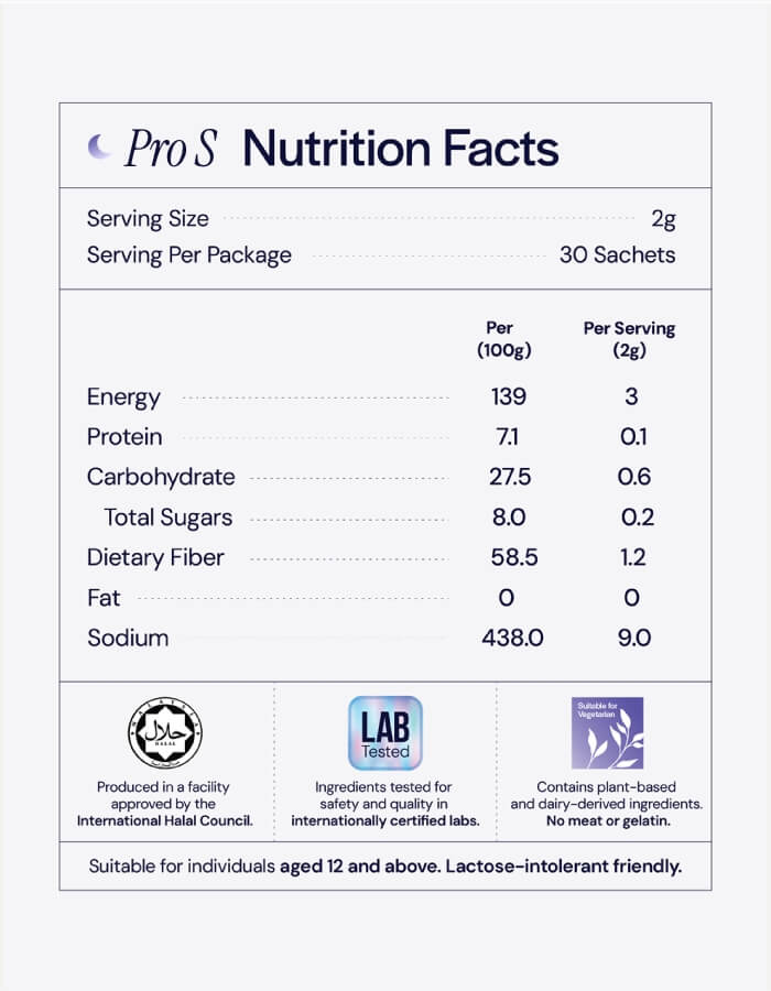 Resistant Dextrin, Inulin (Prebiotics) 25%, Cranberry Juice Powder 10%, Red Raspberry Juice Powder 5%, Jujube Kernel Powder, Live Culture (Probiotics) 128 billion CFU (Lactobacillus plantarum, Bifidobacterium breve, Bifidobacterium lactis) 5%, Postbiotics (Lactobacillus fermentum) 5%, Maltodextrin, Magnesium Glycinate, Vitamin C, Acidity Regulator (INS 330), Anti-Caking Agent (INS 551).